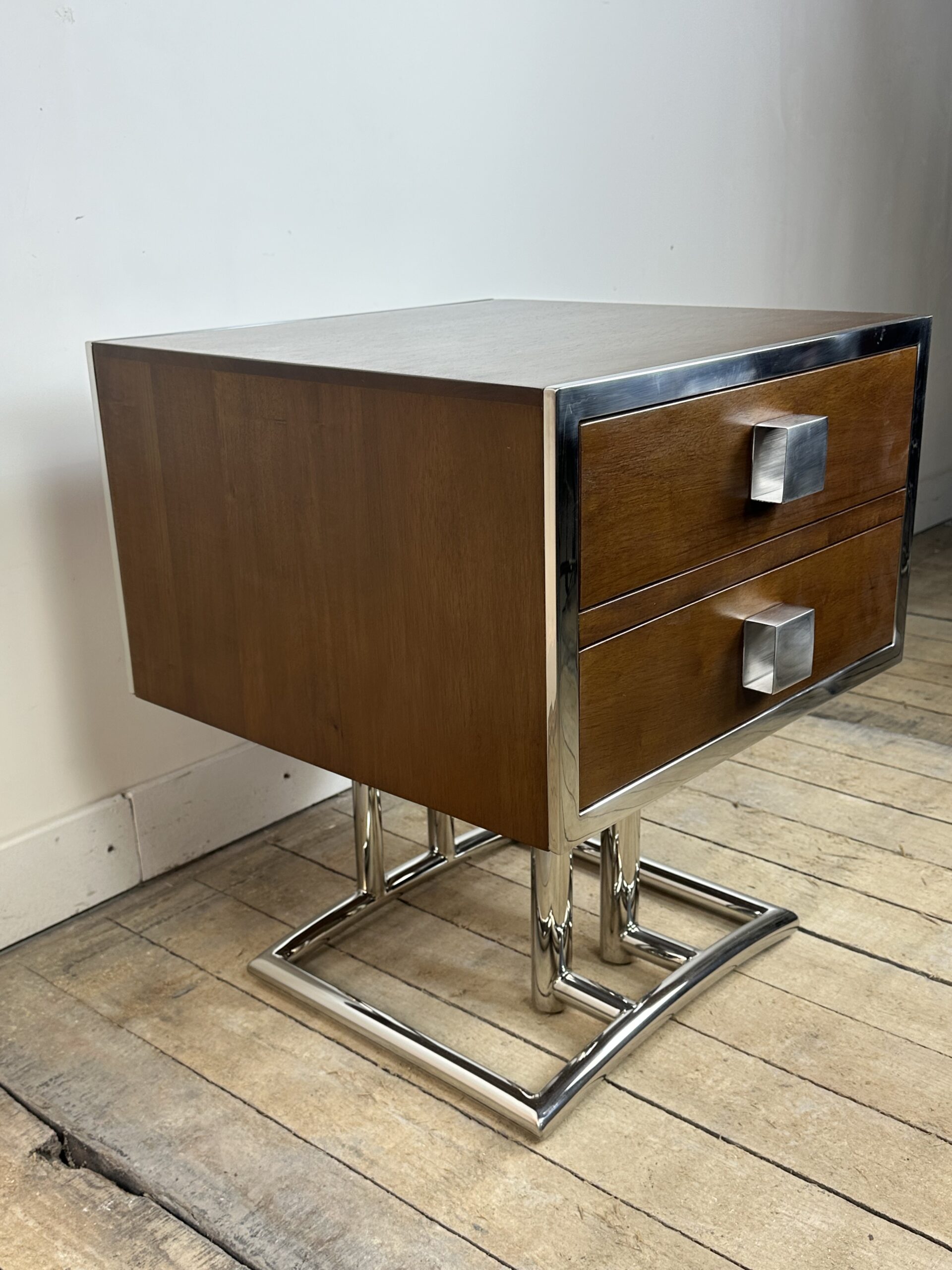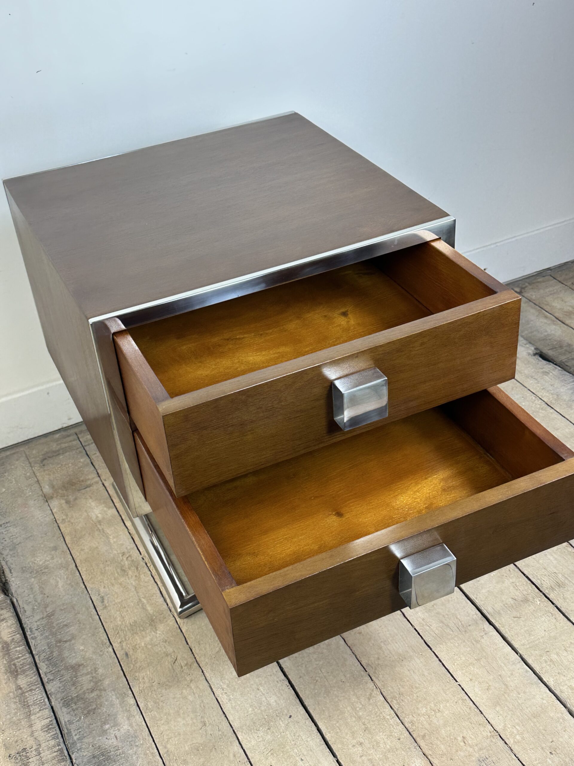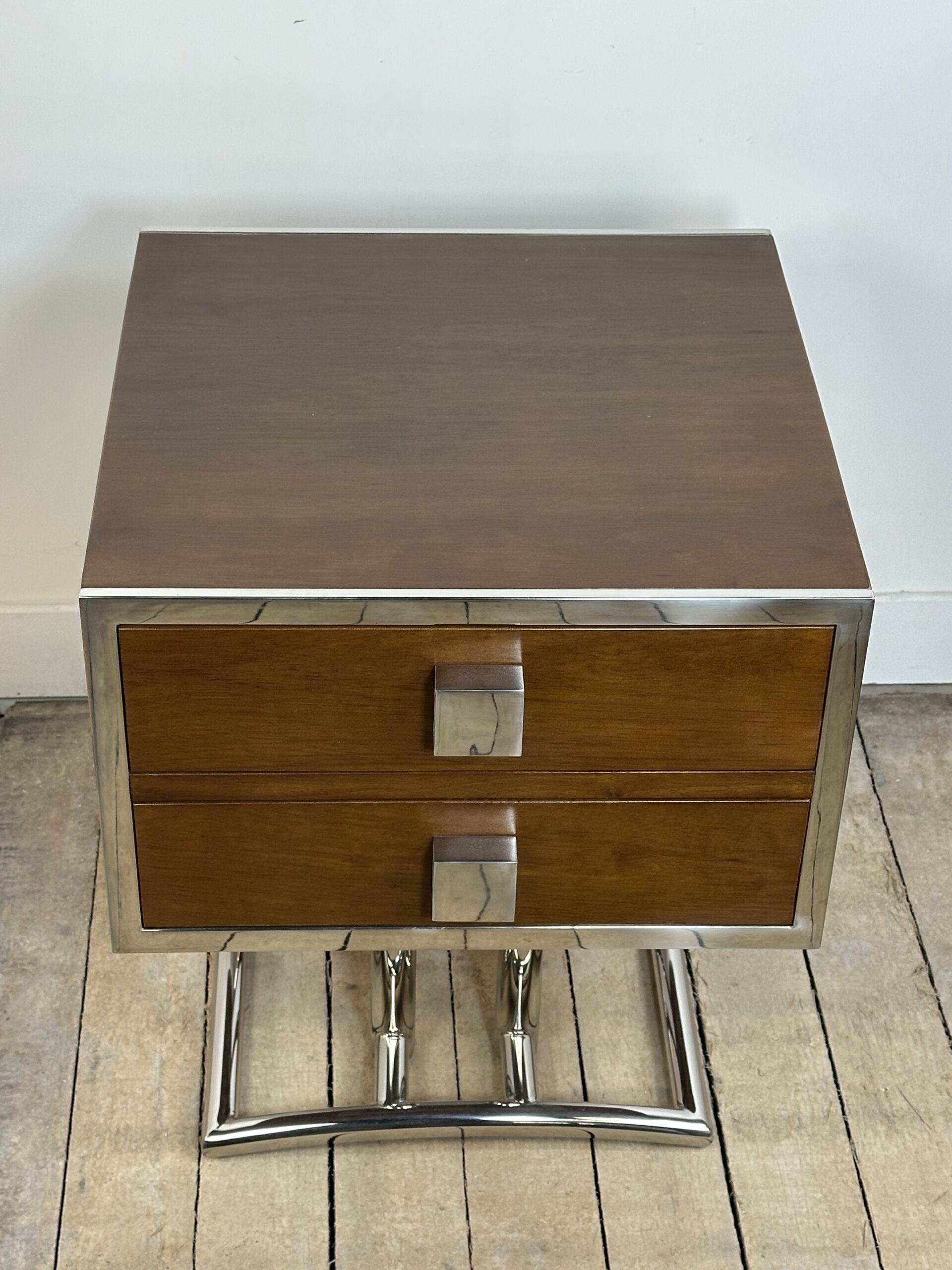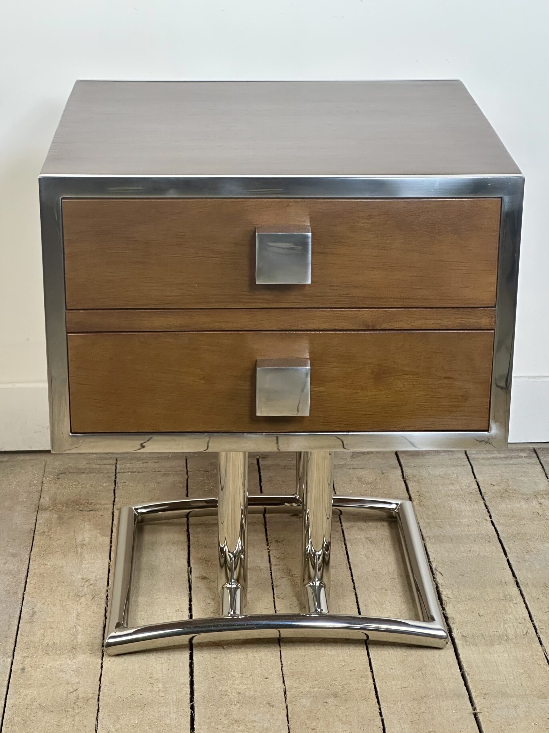 Bout de canapé / chevet ou table d’appoint de style art déco en bois teinte noyer et inox chromé (inoxydable)