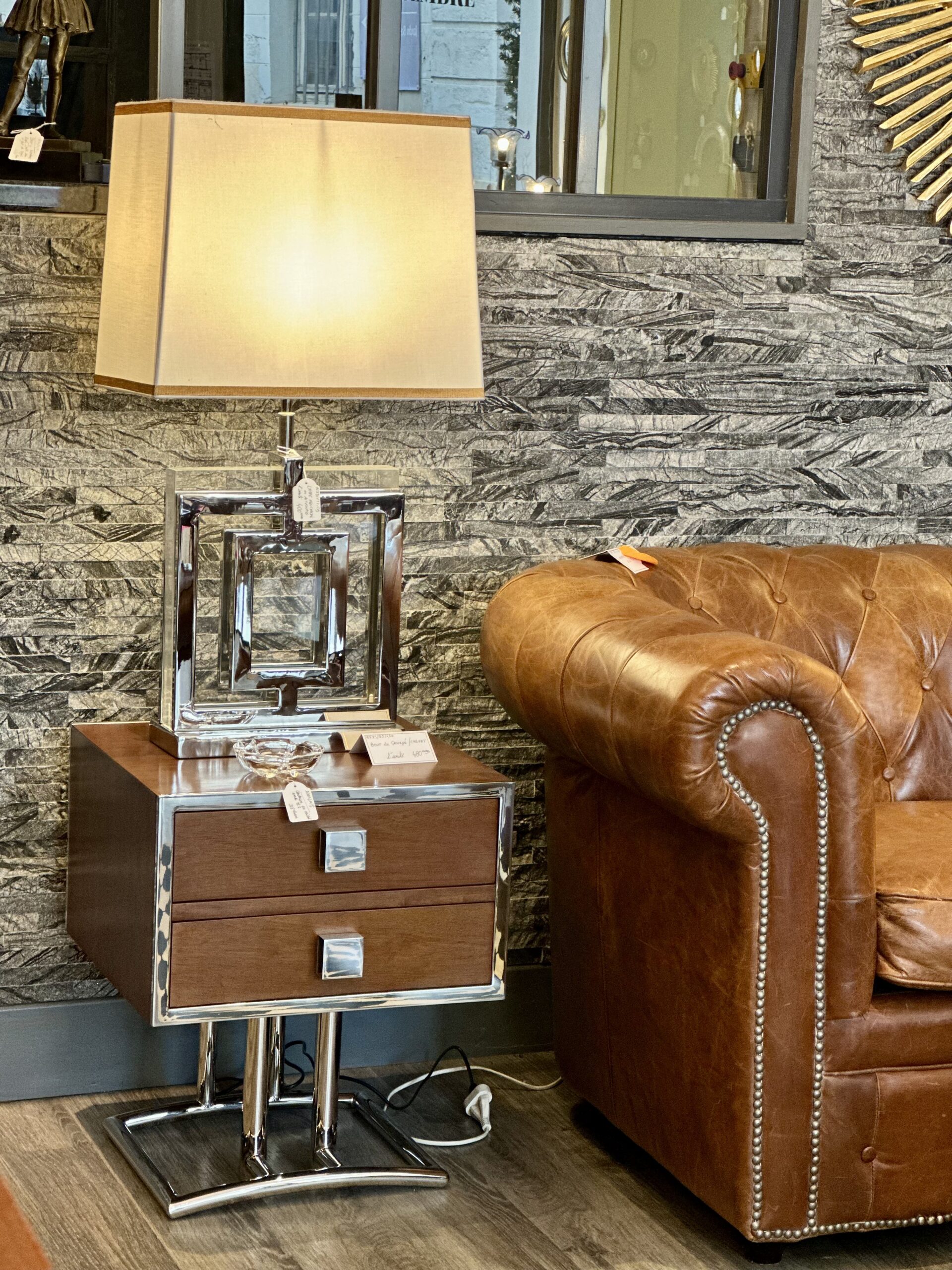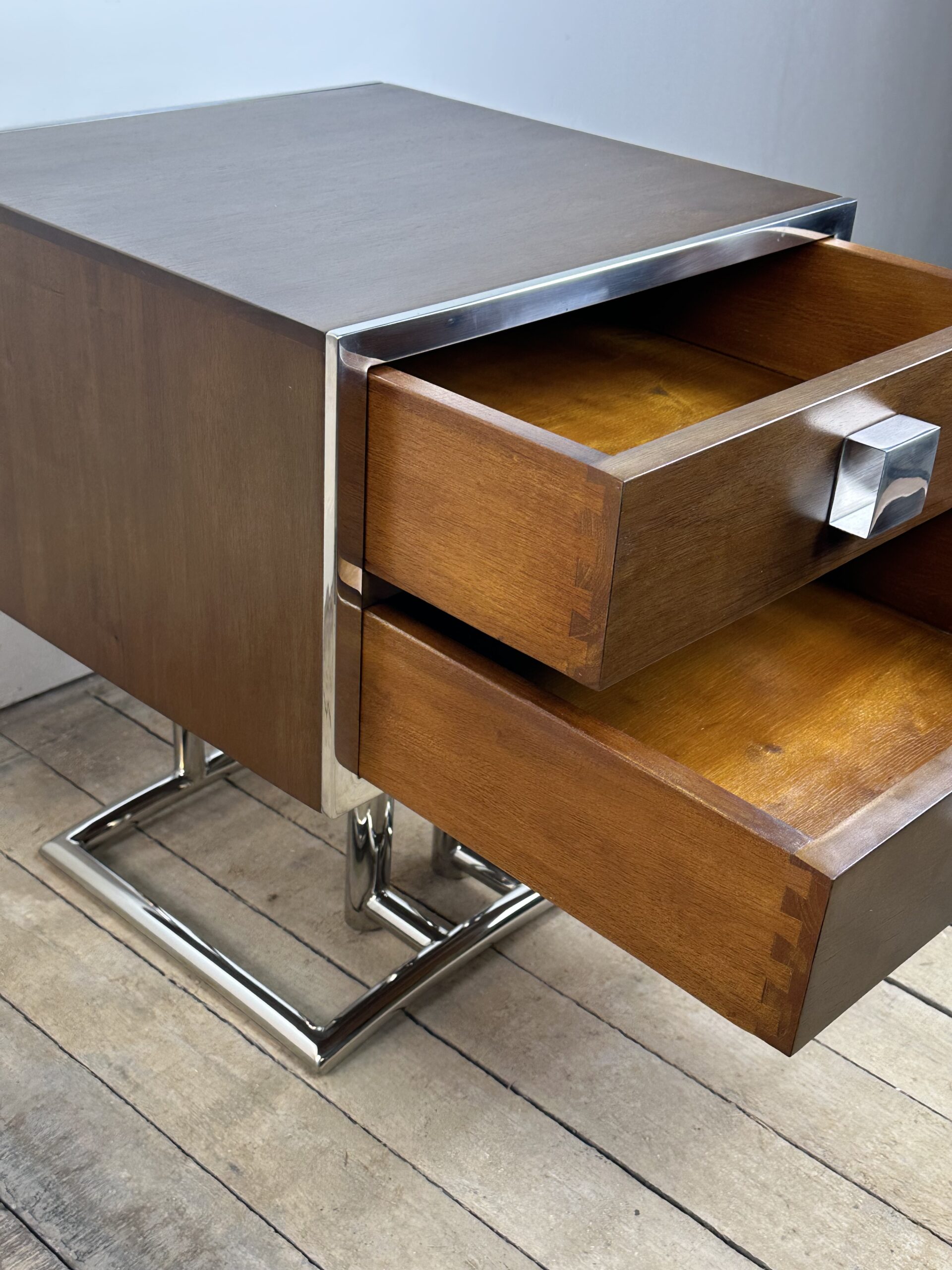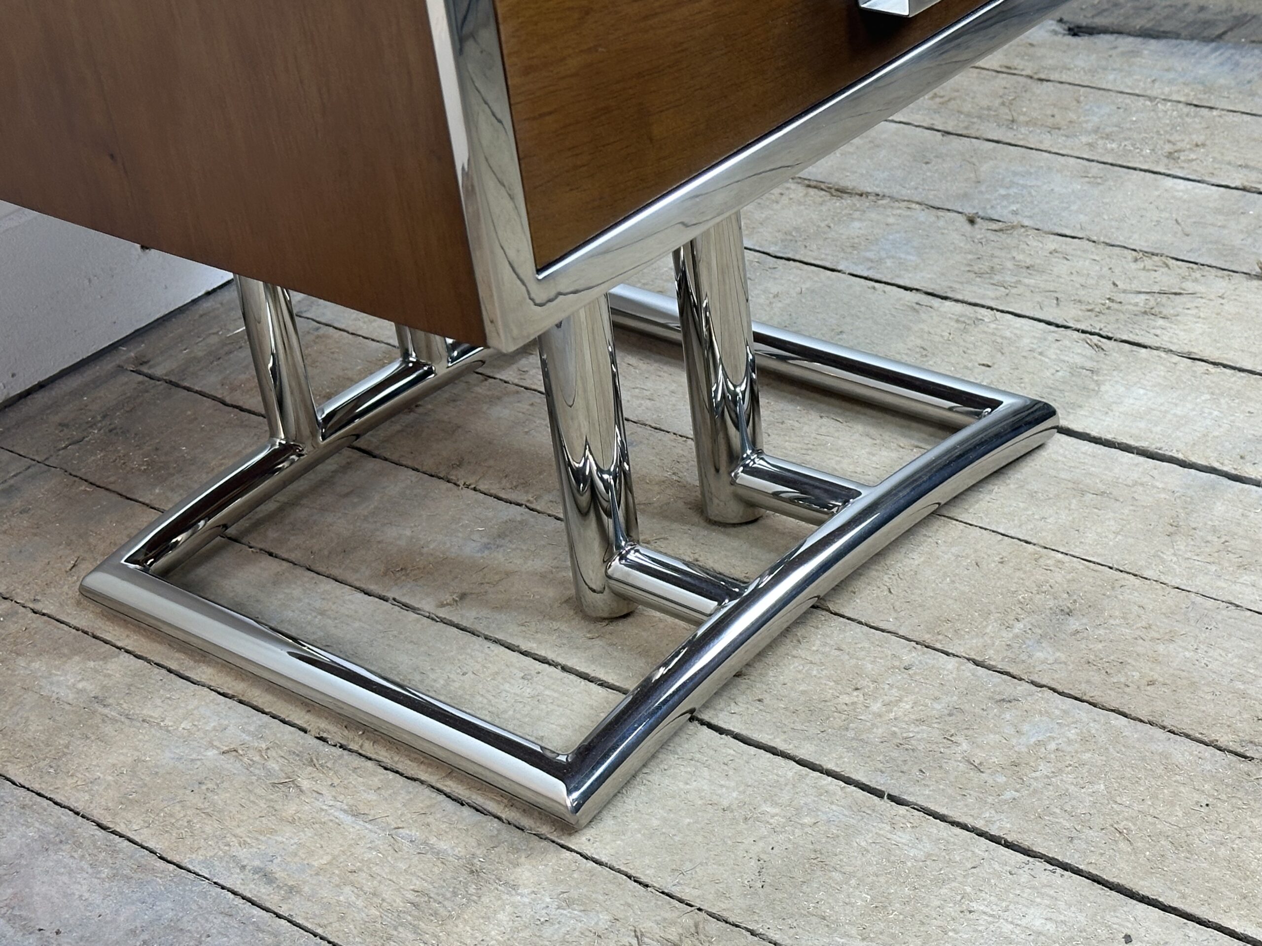 Bout de canapé / chevet ou table d’appoint de style art déco en bois teinte noyer et inox chromé (inoxydable)