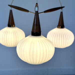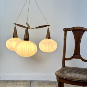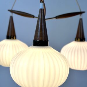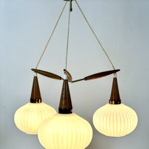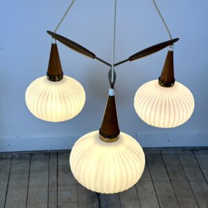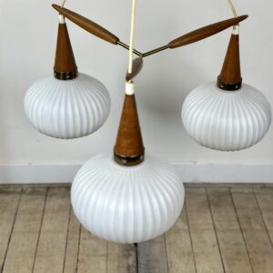 Monture en laiton et teck , 3 feux , boules en verre opalin.