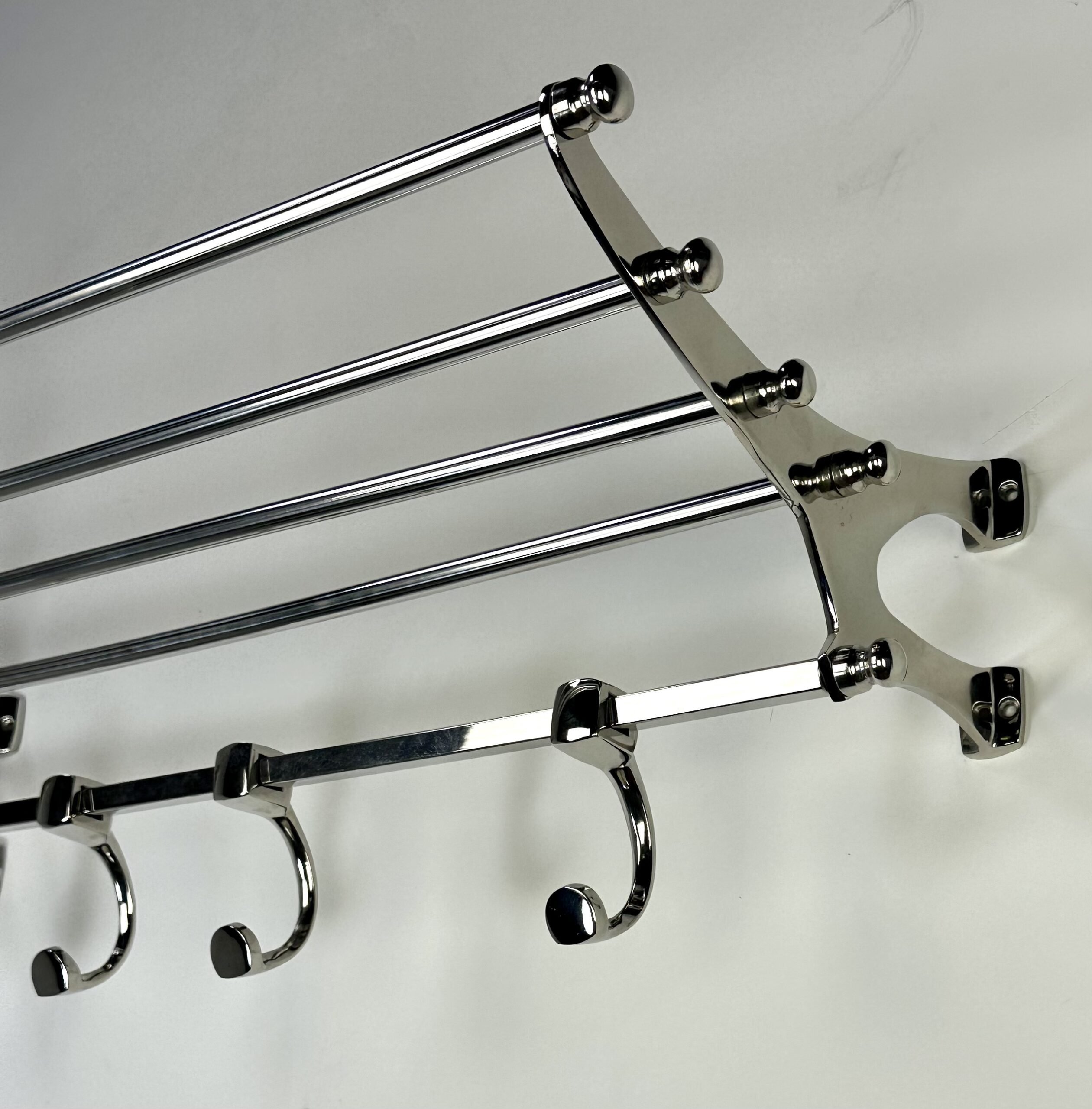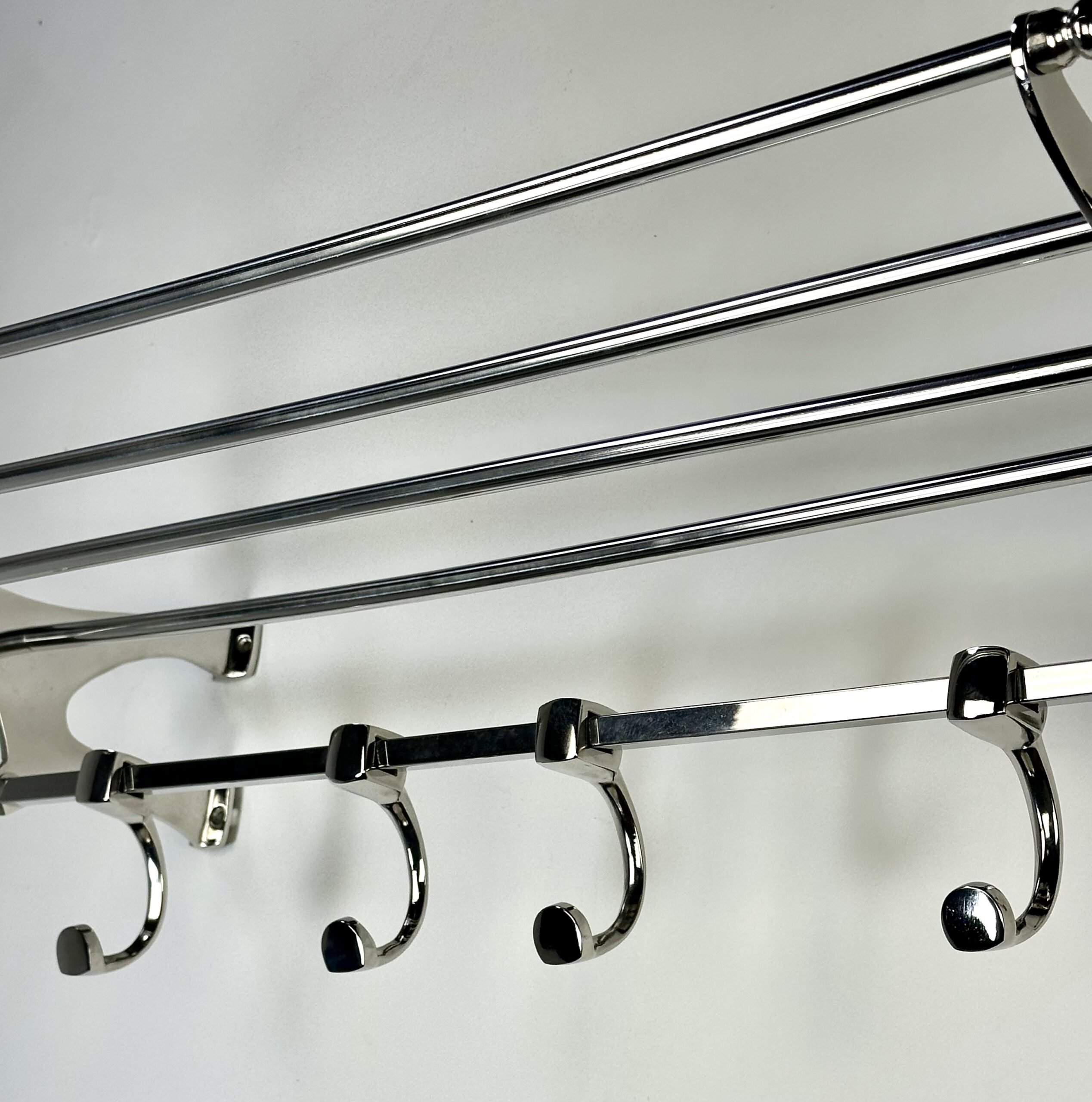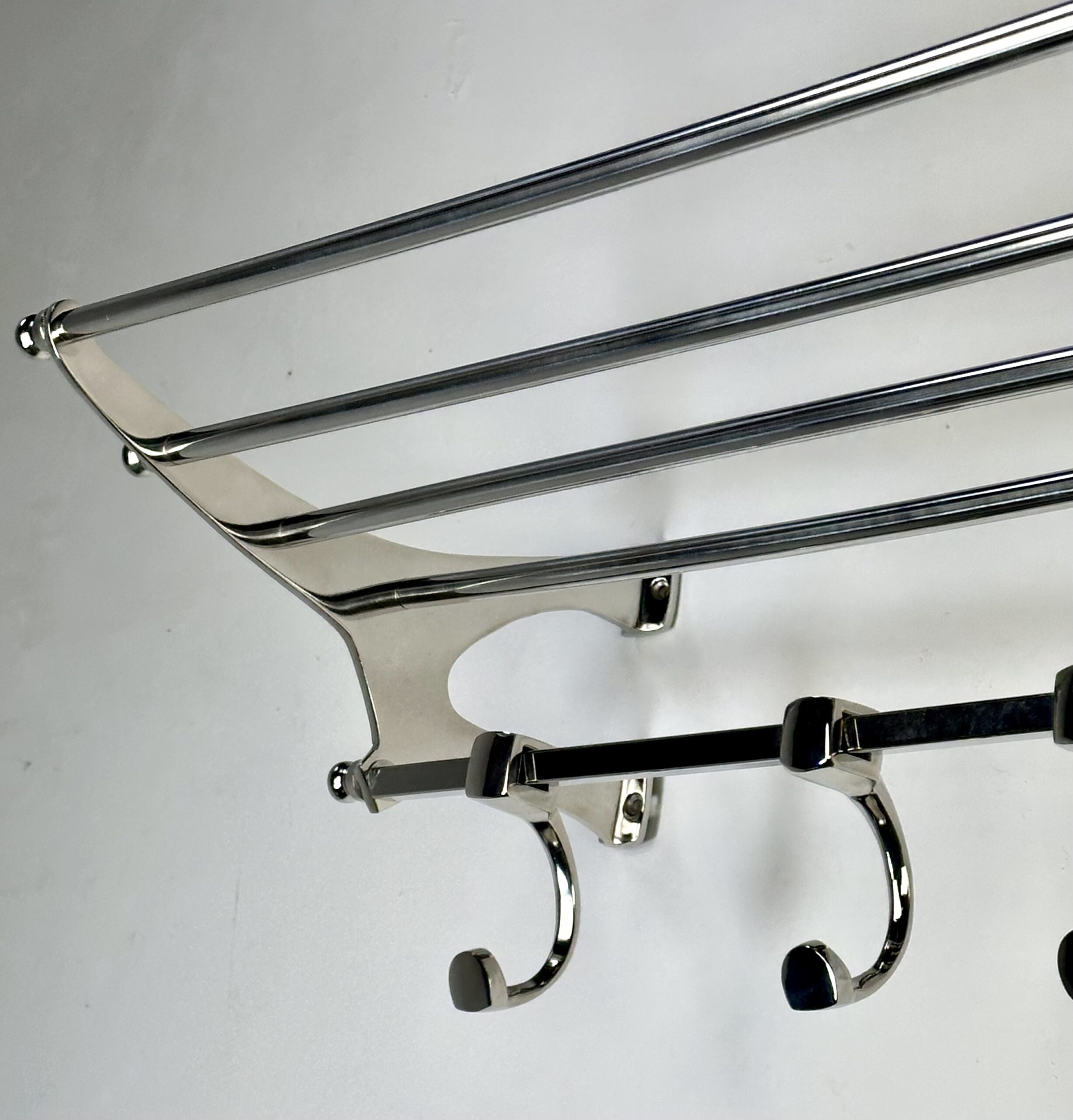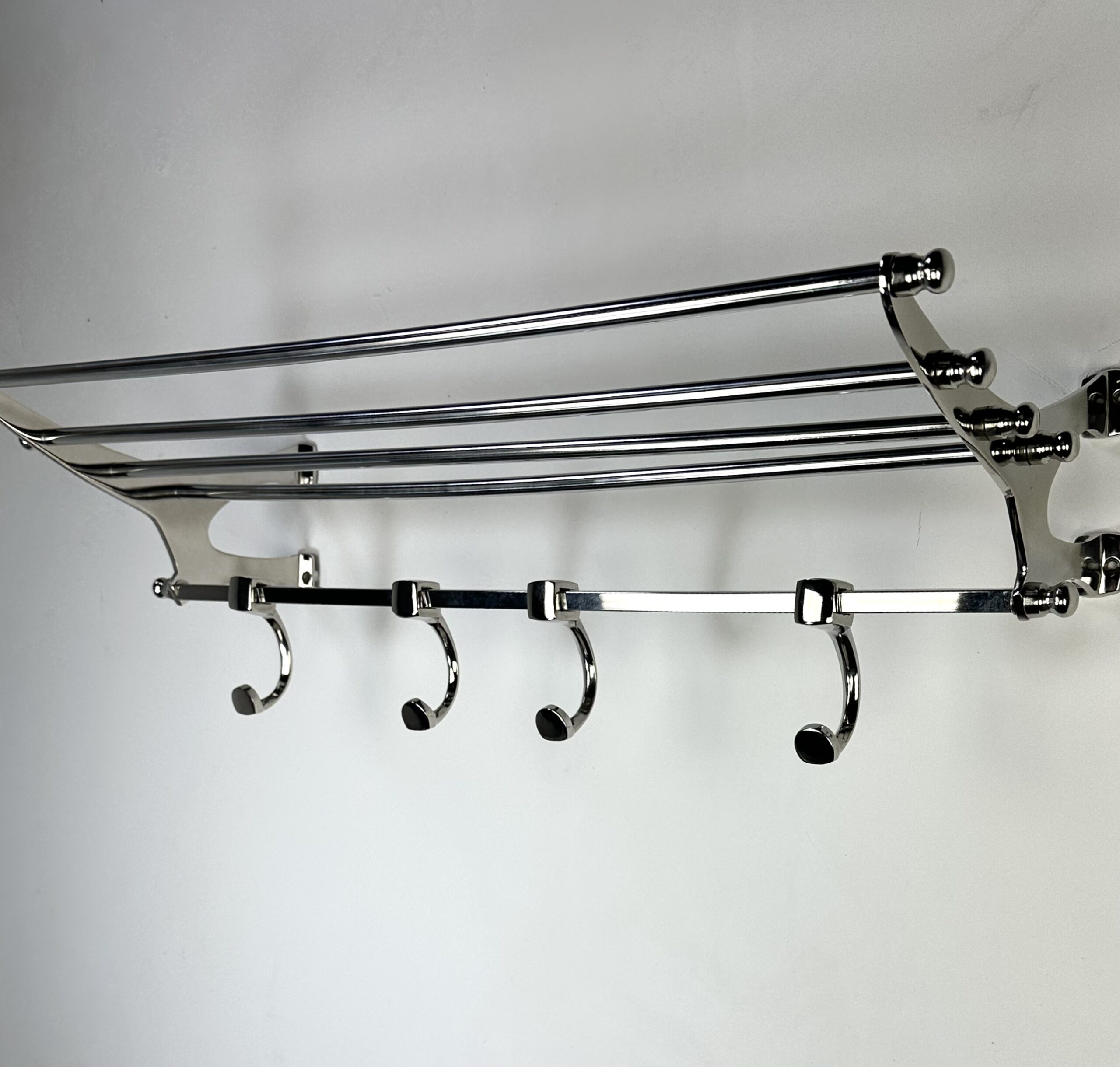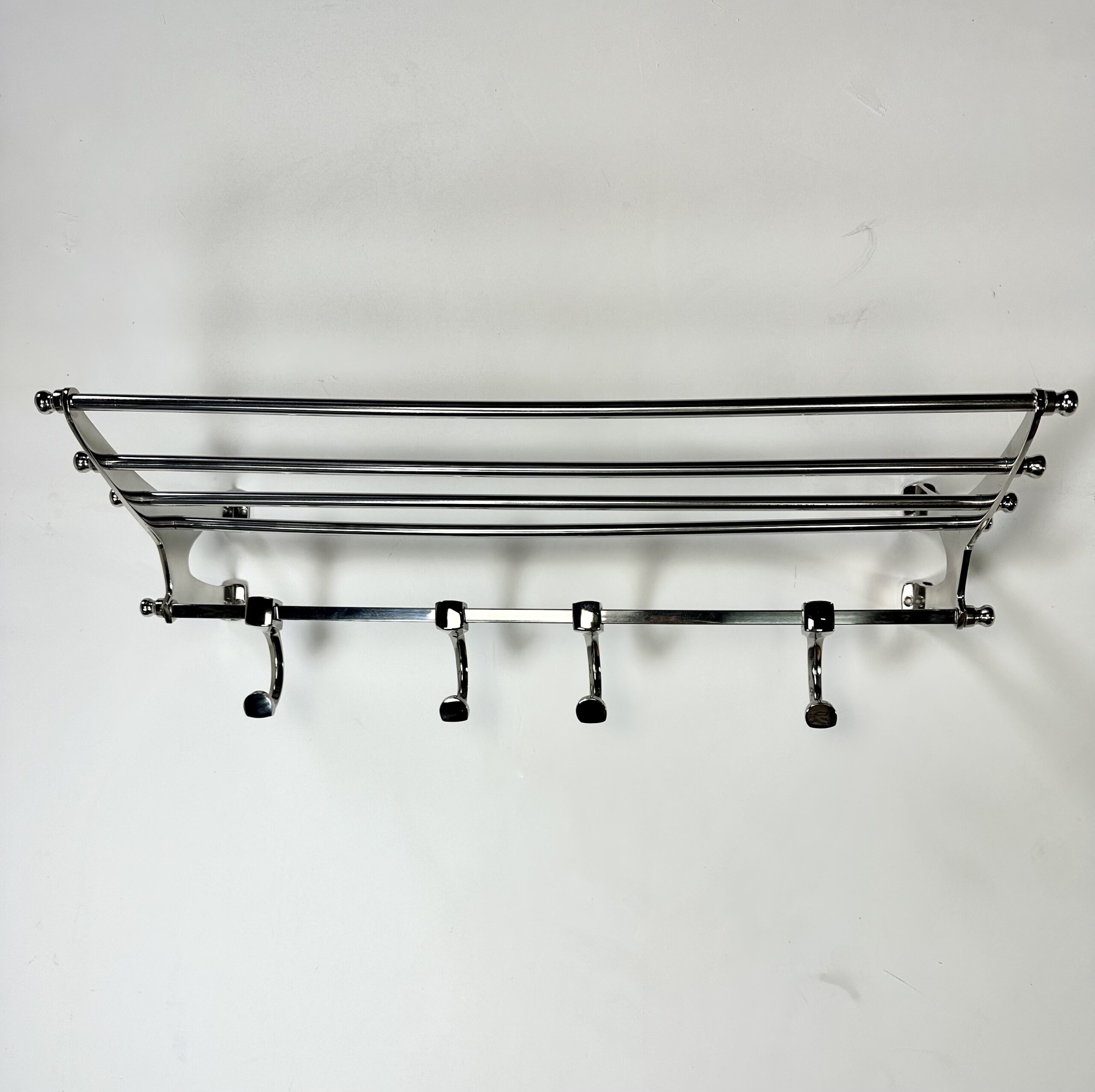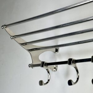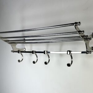 Porte manteau étagère murale « train » en aluminium chromé brillant avec ses 4 patères rappelant les vieux trains mais avec une belle finition de chrome. l’avantage de l’aluminium rend ce porte manteau léger mais très solide. 8 trous pour fixation.