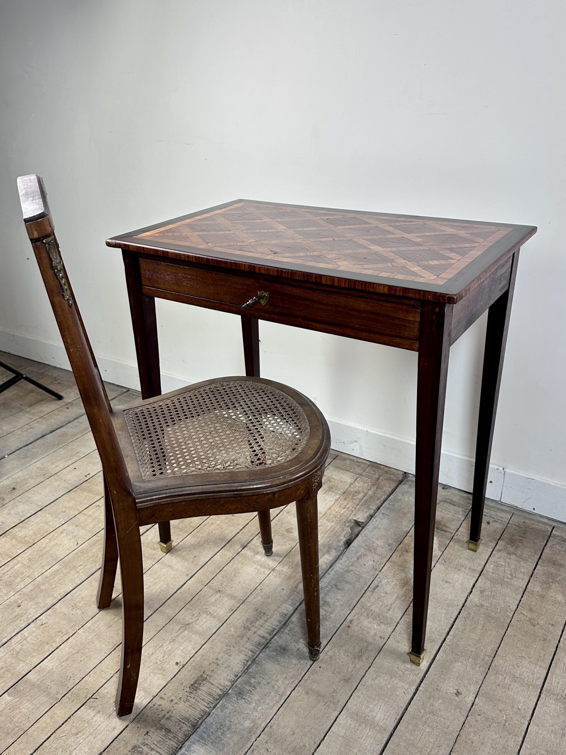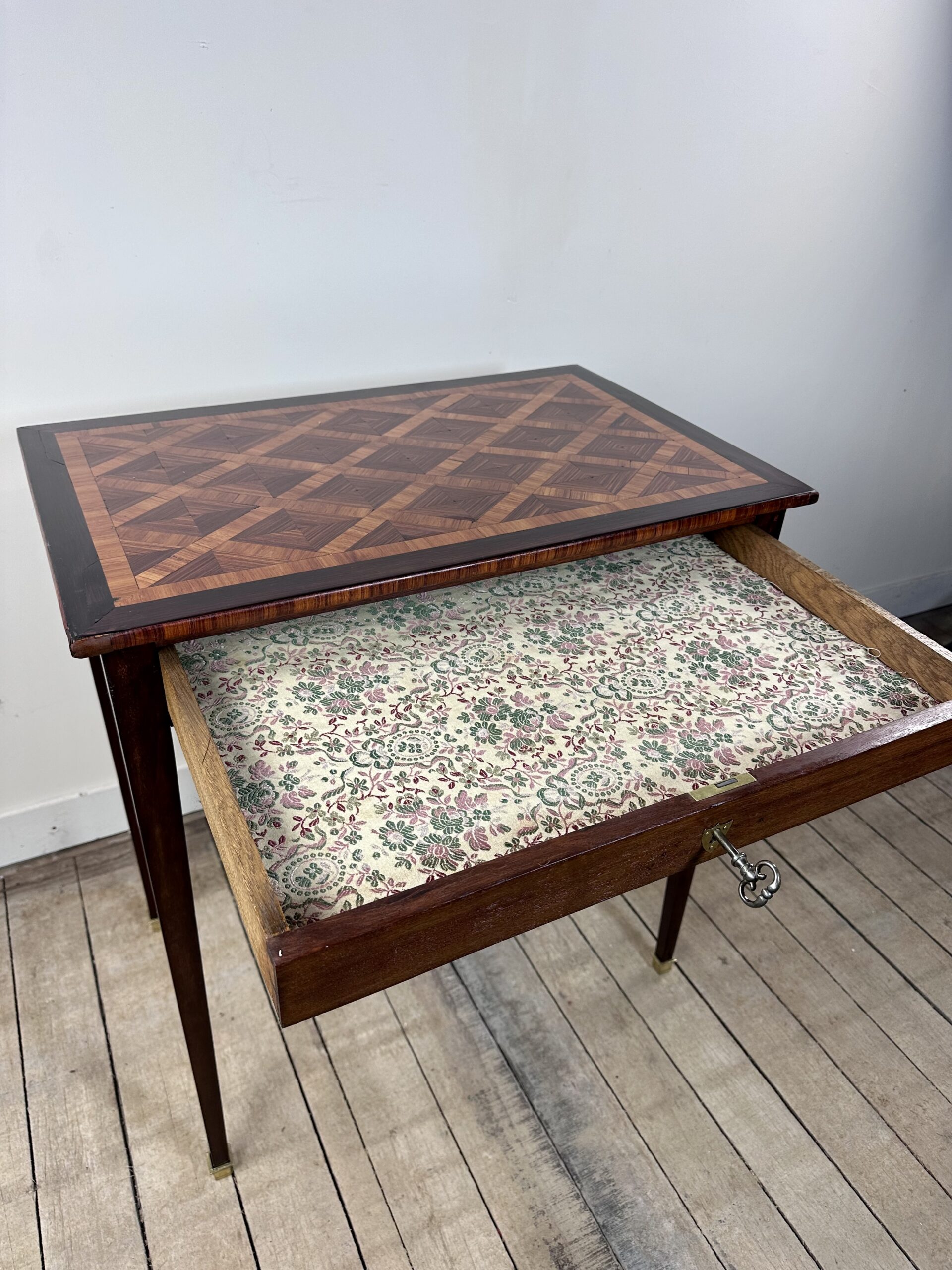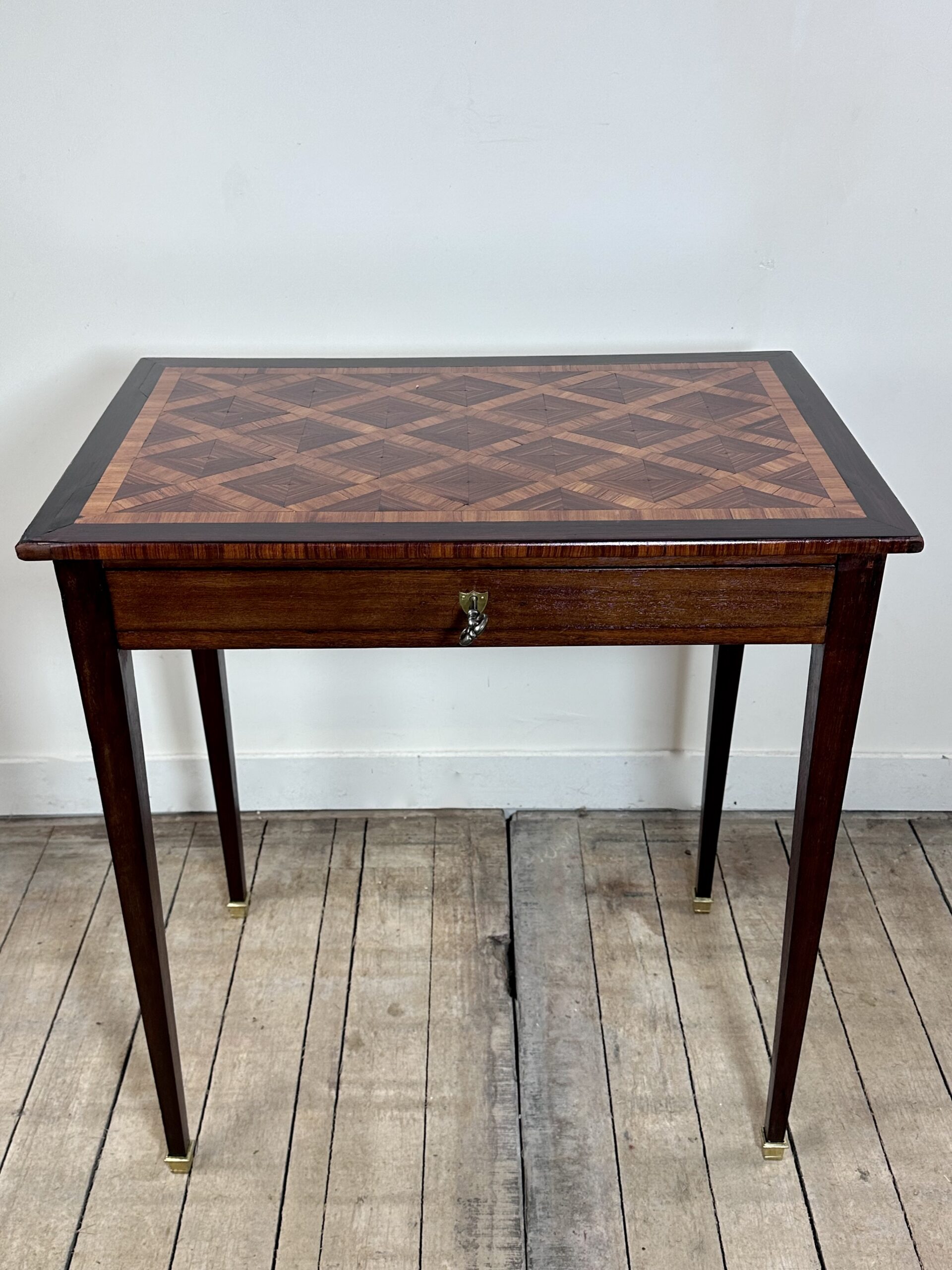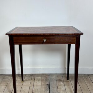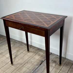 Petite table, écritoire de style Louis XVI à décor de marqueterie de cubes sur le plateau.